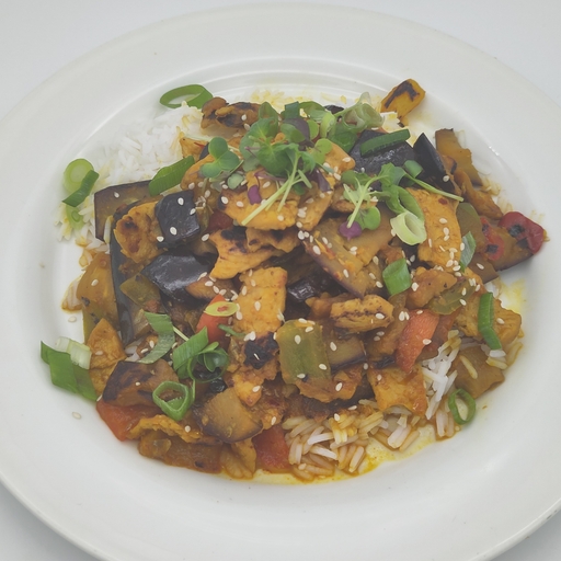 Miso Nasu Donburi - Pea protein strips with vegetables, sesame and basmati rice (2,f,m)